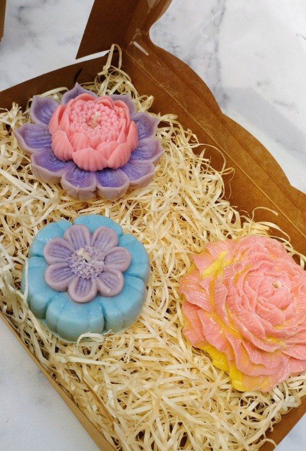 Holiiii, hoy les presentamos ésta box con tres velas aromáticas en forma de flor 🪷 🌸 🌹