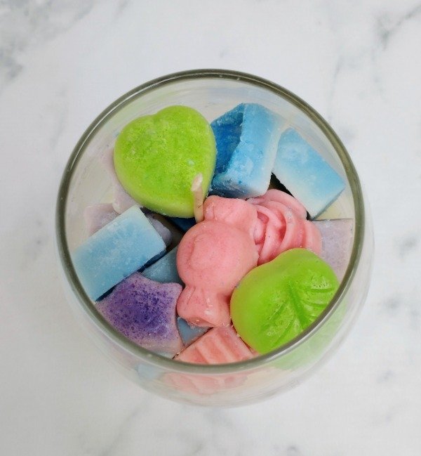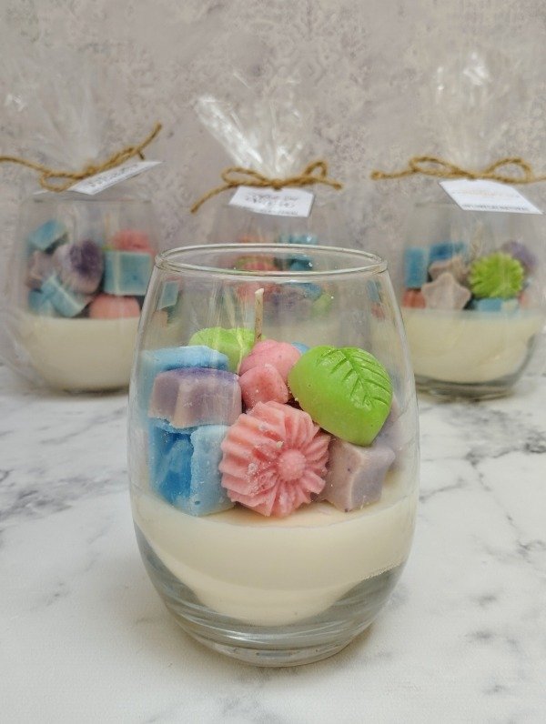 Viene una vela aromática en 3 aromas increíbles: vainilla caramelo 🍬, Jazmin y naranja 🍊 y flores blancas y peras🍐🌸 arriba vienen todos estos bomboncitos aromáticos para darle color y diversión a este diseño